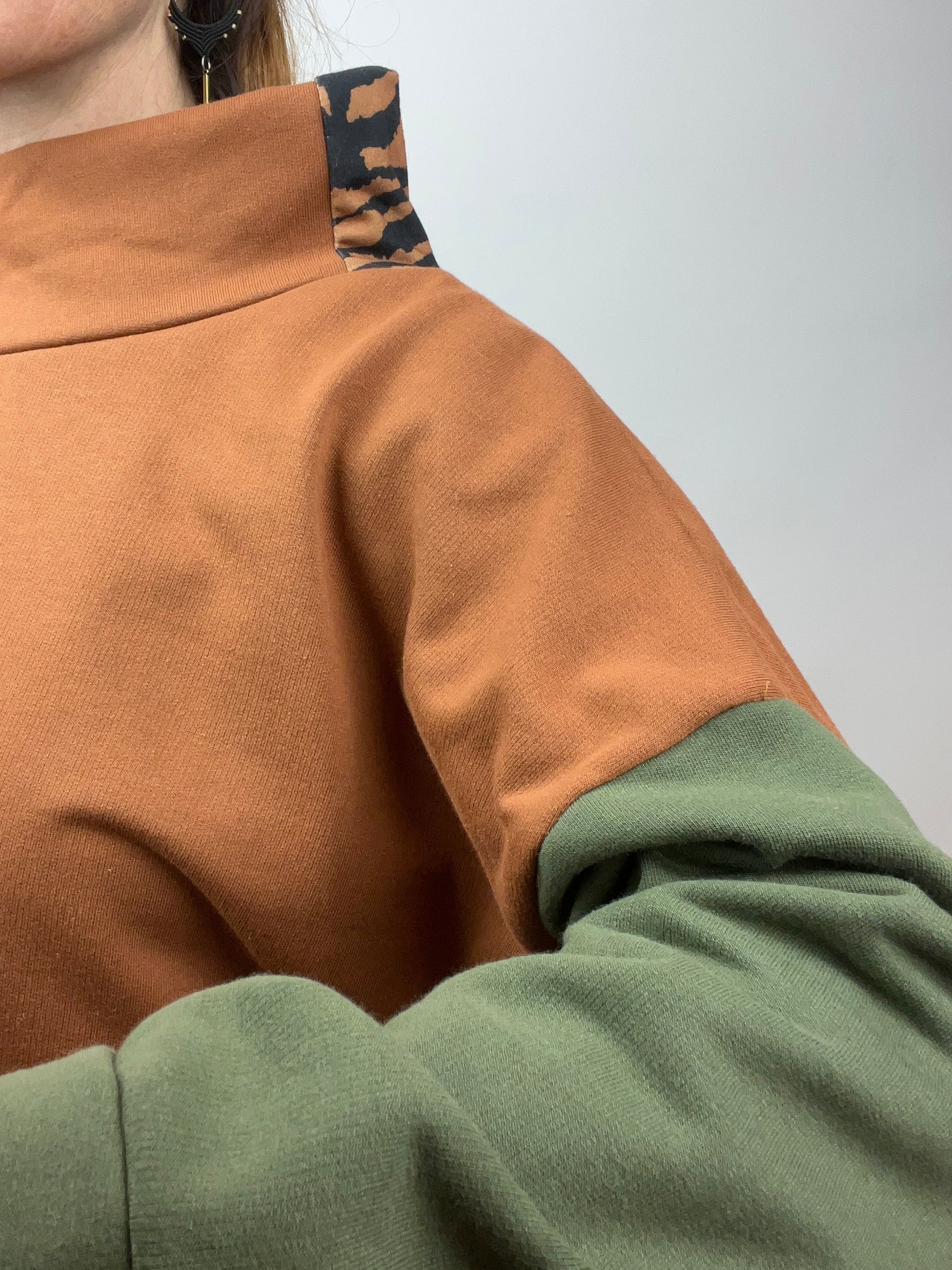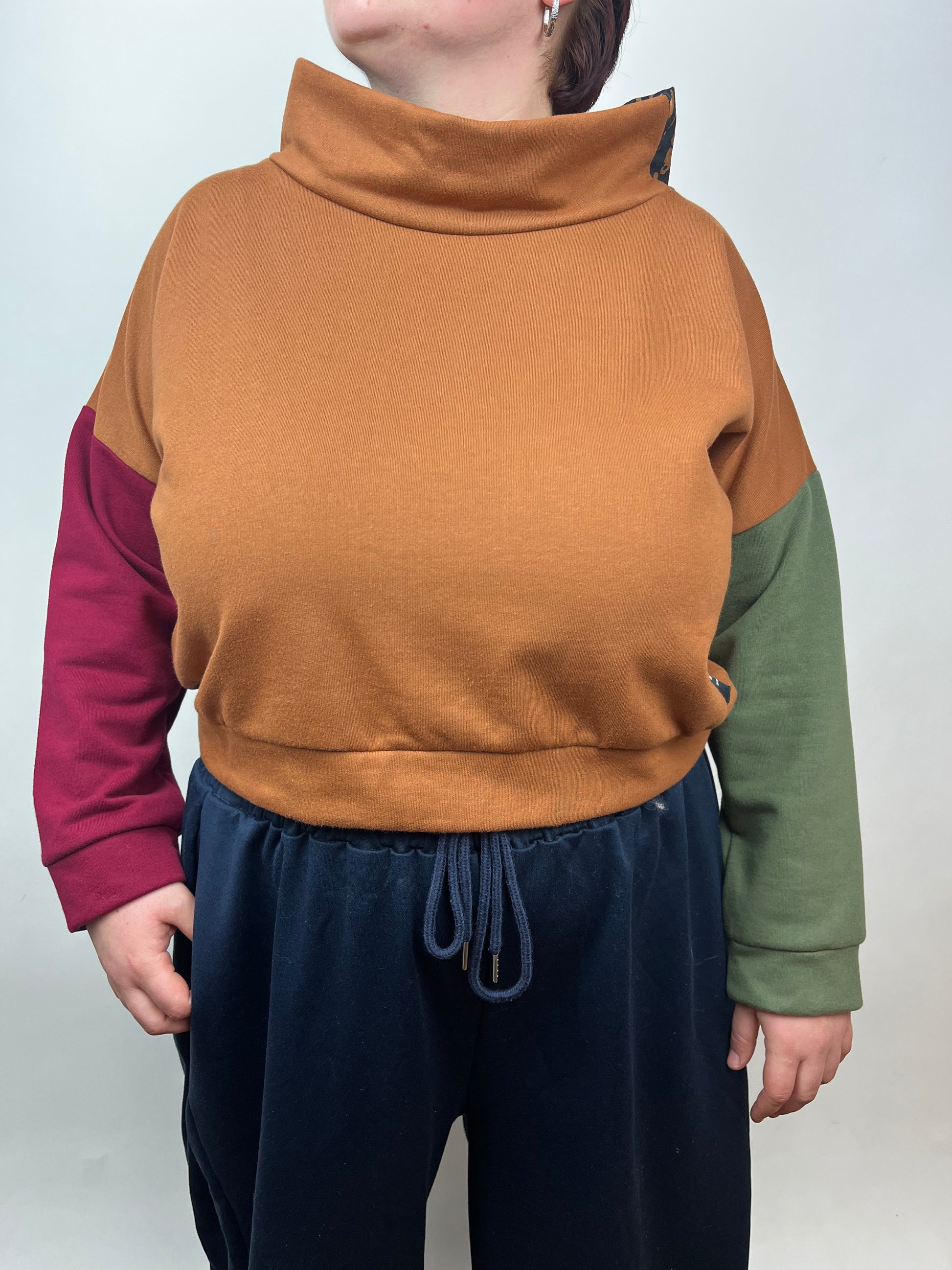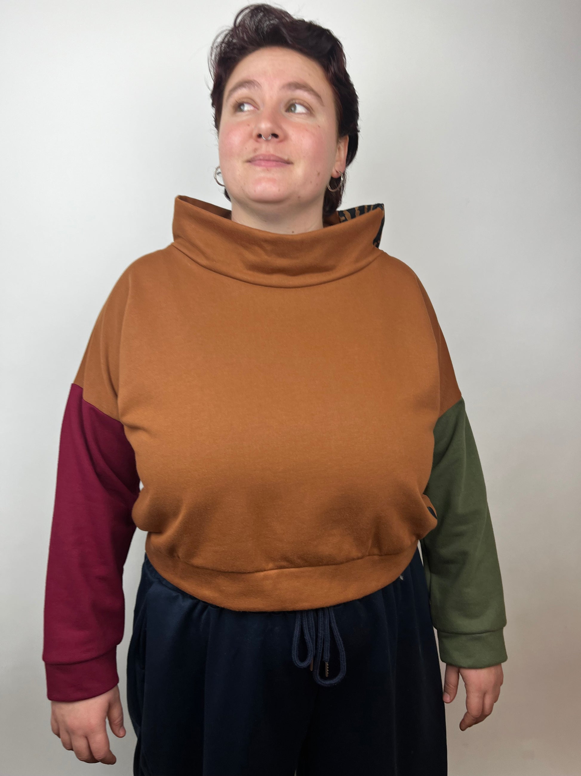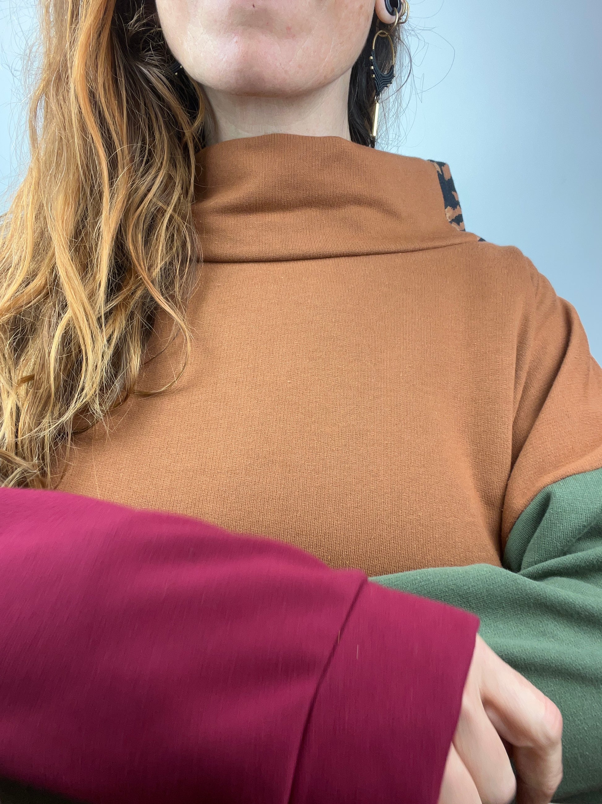 Base en color granate frambuesa, con mangas en teja y rosa palo.